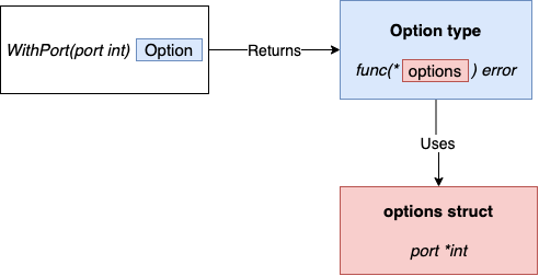 type Option func(options *options) error. For example,WithPortaccepts anintargument that represents the port and returns anOptiontype that represents how to update theoptionsstruct.